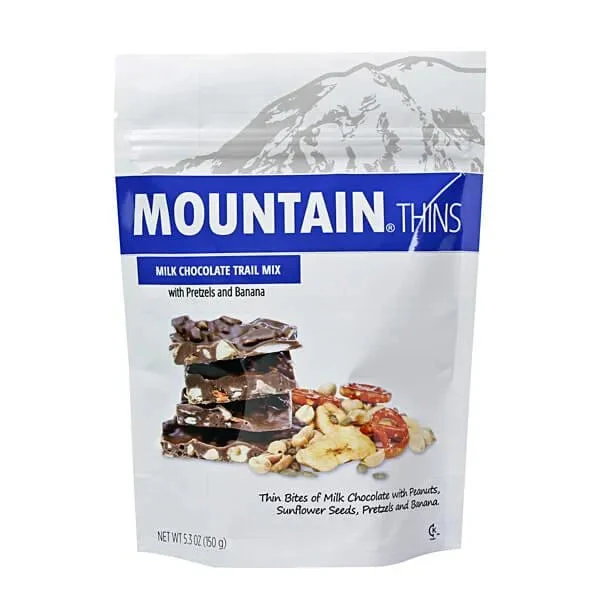 Bag contains 5.3 ounces of Milk Chocolate Trail Mix Mountain Thins Candy.