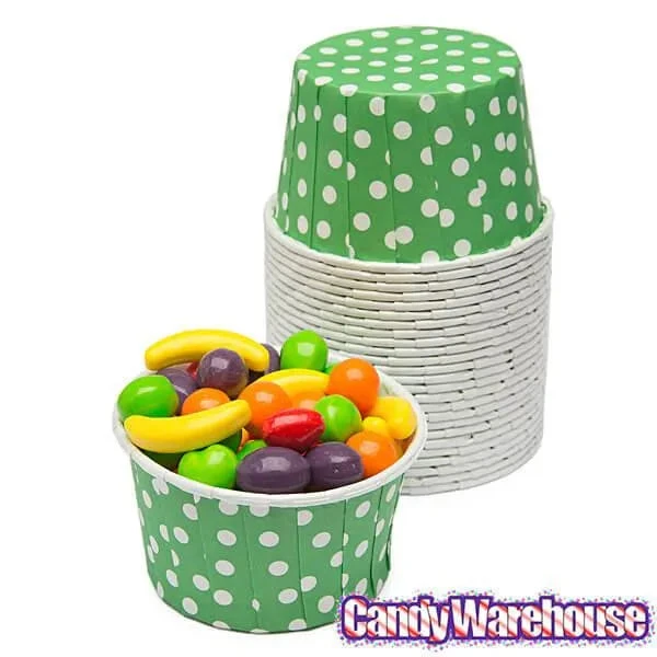 Pack contains 25 Dark Green Polka Dot Paper Candy Cups, each with a capacity of 4 ounces.