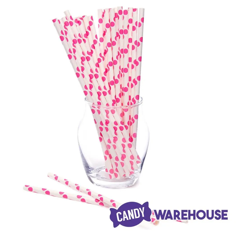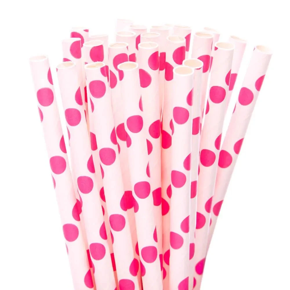 Bag contains 25 White with Bubblegum Pink Polka Dots Paper Drinking Straws.