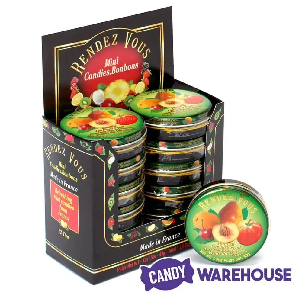 Display box contains 12 Rendez Vous Orchard Fruit Mini Bon Bons Candy Tins.
